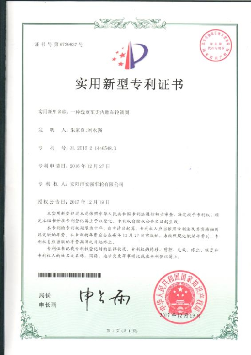 專利證書(專利號:ZL201621446548.X)